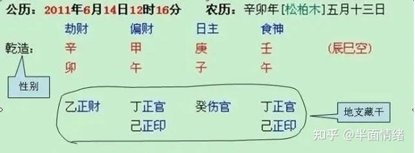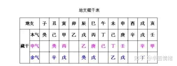 每个地支中都藏有天干,其阴阳及对应的五行依据所藏天干主气来看就可以了,下面的表格藏干是按主气,中气,余气来写的。(这三个名词不懂先绕过去看下面)