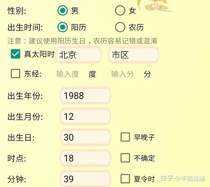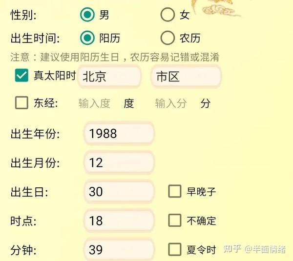 二、找个可以排八字命盘的网站或者软件,把自己的出生年月日时辰输进去(最好用真太阳时,也就是当地时间)一定看清楚,不要输错哦。排好以后最好看看出生的时间对不对。
