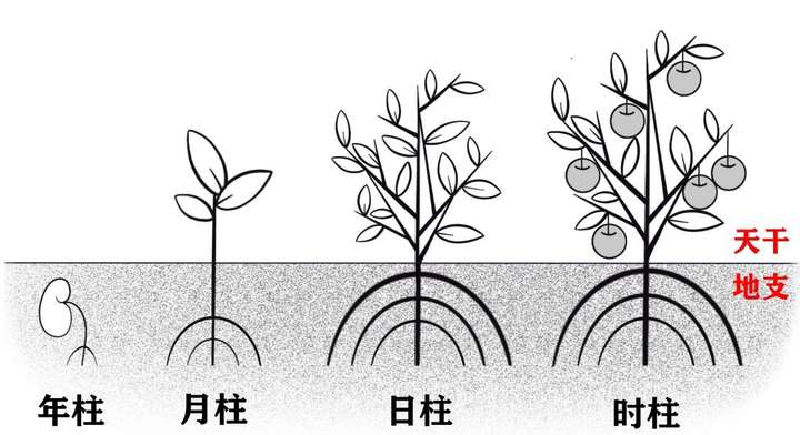 四柱八字宫位的象义:取日干为主,以年柱为根,以月柱为苗,以日柱为花,以时柱为果。
