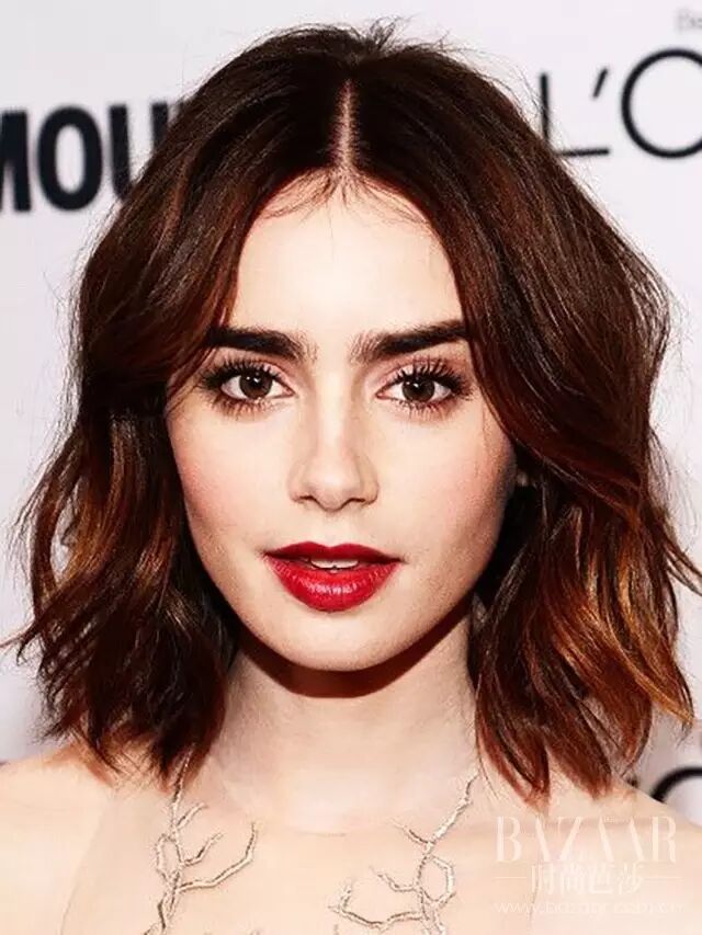 而Lily Collins则是把八字刘海“演绎”得最好的,这款发型不仅可以露出额头还能显脸小,长发短发的姑娘都超级适用!