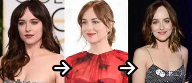 八字刘海还有一个特别棒的作用就是,帮你完美的过渡蓄发的尴尬期。看Dakota-Johnson的示范,从短八字刘海,留长,到中分,基本上无缝连接,再也不用忍受难捱的蓄发期了!以前想从齐刘海留到中分,我们通常会将刘海用发夹别起来,而且起码要忍受半年以上。而剪了八字刘海就完全不需要了,蓄发的中间可以稍微修剪1、2次,以保持八字刘海一直好看的形态。就这样不知不觉你就把刘海留长了,如果有妹子最近想把刘海留起来的话,八字刘海也是你蓄发期的首选哦!