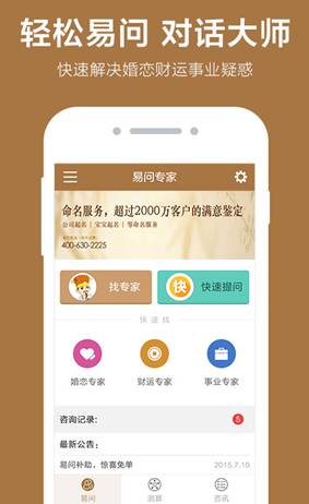 与八字算命、六爻断卦、风水布局、星座占卜、紫微斗数、周公解梦、手相面相、黄历择吉、奇门遁甲等资深易问命理学家在线聊天预测,轻松解决事业前程、投资理财、恋爱交友、感情婚姻等运势难题!
