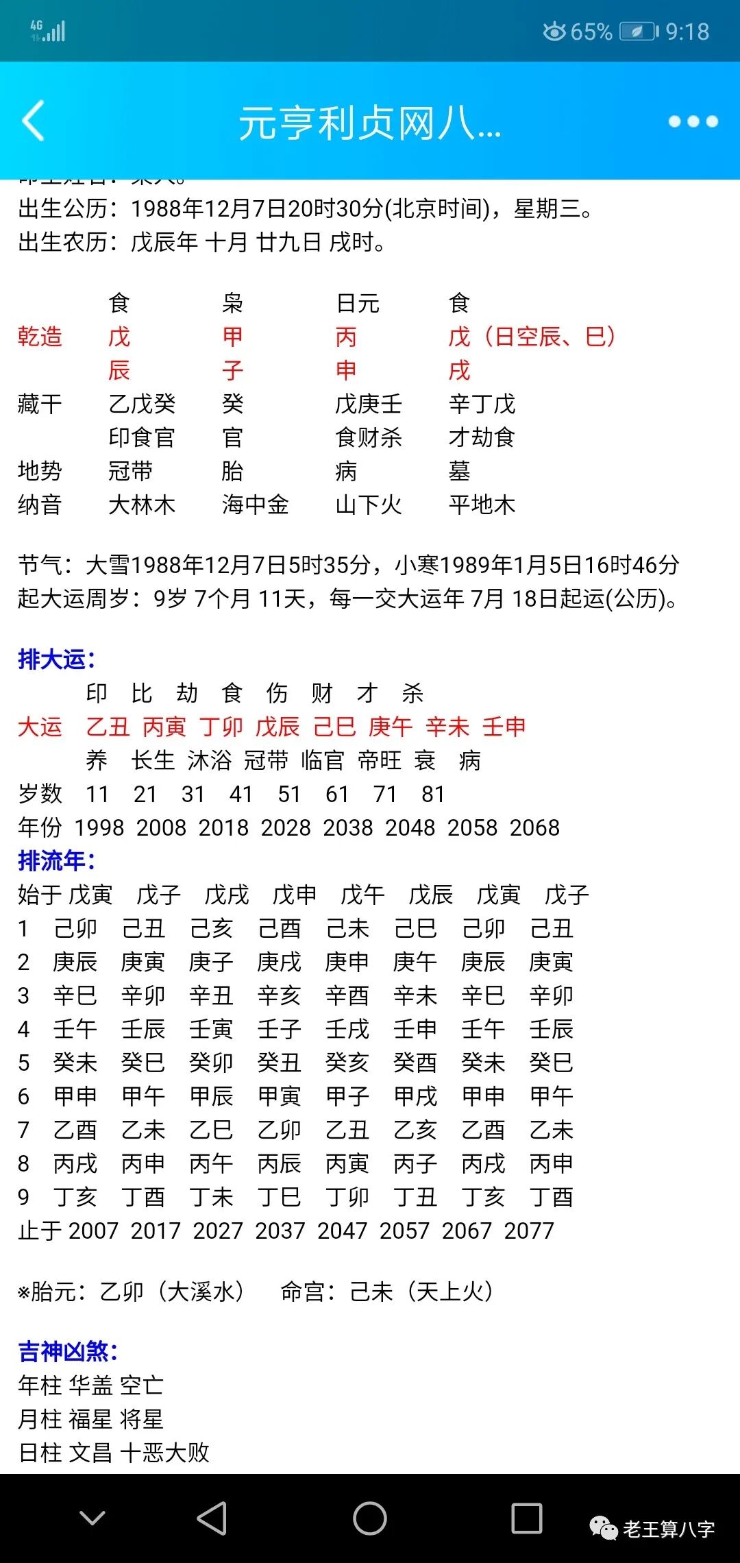 吕。。 男 出生地安徽省芜湖 阴历88年10月29日晚上八点半 一,分析八字日干五行旺弱日干为丙火代表命主,生在冬天子水月令,八字水旺克火,故八字身弱。八字讲究五行平衡,身弱喜生扶,木火能生扶日干丙火,故木火为用神。身弱不喜再逢克泄,土金水能克泄日干丙火,故土金水为忌神。二,分析事业财运命主生在冬天子水月令,子水为官星代表事业工作,八字身弱忌子水官星克身,且地支申子辰又三合水局,合了官局克身,官代表事业工作,官旺克身,故命主来自事业工作方面的压力较大。幸好月干透出甲木印星,印星能化官生身,化忌为用,起了非常关键的作用。印星代表关爱和关心帮助你的人,也是你的贵人,印星为用神,说明命主平生多遇贵人相助和提携,也会有好的工作环境,一生平稳,不会有大起大落之象,也是有福之人。财运看财星,申金为财星代表钱财和经济,八字身弱也忌财星耗身,好在八字有申生子,子生甲木,甲木再生日干丙火,丙火代表命主,财官印全部流入到命主身上,归命主所有。财为养命之源,官星为护身之本,印星代表靠山和依靠,财官印入身,也说明命主平生衣食丰足,钱财不缺,虽不能大富,但过小康生活也会绰绰有余。官星又代表官职官位名气等,印星权利,官印入身,也说明命主比较适合做一些管理工作,有一定的管理能力。八字土多土旺,土为食神代表技术技能才华等,食神生财又代表财源,所以命主也适合做一些技术技能含量更高的工作,靠技术和才华求财也很不错。印星又代表文化知识教育,也代表学校,食神代表学生,故命主也可以从事与教育有关的行业。总之,命主八字格局不错,很利事业工作及财运发展,只要积极努力大胆去干,就一定会有不错的收获。三,分析婚姻感情男命看婚姻,一看财星代表妻子,二看日支妻宫,为妻子的宫位,看二者在八字中的状态如何,就能知道命主的婚姻感情情况。命主八字土多土旺,土为食神,食神生财,财星代表妻子,财星逢生,说明命主很爱妻子,为妻子付出较多。申金为财星居日支妻宫,为妻子归位,也说明妻子顾家持家,家庭观念较强,是一位不错的贤妻良母,且八字有申子辰三合局,说明命主未来婚姻稳固,夫妻和睦恩爱相处,且能白头到老。总之,从八字组合来看,财星和妻子在八字中状态都比较好,说明命主在未来婚姻当中,不会有什么大问题,如果再好好珍惜和用心呵护,未来婚姻幸福指数会更高。四,分析身体健康情况八字五行平衡才会身体更健康,五行过旺或过弱都有不利身体健康之象。命主八字五行基本平衡,且甲木印星代表身体健康,在八字中发挥了很好的作用,说明命主身体很健康,如果命主平时再更加注重养生,则身体会更健康。五,分析今年流年和流月运势今年是壬寅流年,流年寅木引动八字甲木正印生身,正印代表关爱和关心帮助你的人,是你的贵人,说明命主今年会有贵人相助和提携,运势不错,故要好好把握住机遇才好,只要有努力,有追求,就一定会有不错的收获。从流月运势来看,农历一月份为壬寅流月,农历二月份为癸卯流月,农历三月份为甲辰流月,这三个月都是木旺的流月,木为印星,印能生身,平衡八字,使命主身旺更能担财官,故命主今年春天运势较好,事业工作及财运都不错,且印星生身也会多遇贵人相助和提携,所以一定要好好把握住机遇才好,切莫错过时机。农历四月份为乙巳流月,农历五月份为丙午流月,农历六月份为丁未流月,这三个月都是火旺的流月,八字身弱也喜火来助身担财,火为比劫代表命主的同事朋友同学同辈合伙人等,所以命主在今年夏天更适合合伙做事或合伙求财,对你会更有利,切忌不要单打独斗对你不利。农历七月份为戊申流月,农历八月份为己酉流月,农历九月份为庚戌流月,这三个月都是金旺的流月,金为财星代表钱财和经济,但命主八字身弱有不担财之象,走财旺流月则财重身弱,多辛苦劳累,故要多加注意,少欲少求,顺应自然会更好。农历十月份为辛亥流月,农历十一月份为壬子流月,农历十二月份癸丑流月,这三个月都是水旺的流月,水为官杀代表事业工作,八字身弱忌官杀克身,说明命主在今年冬天,事业工作方面压力较大,所以一定要合理规划安排,切莫强求冒进和莽撞行事,求稳发展会更好。总之,从2022年一年的流月来看,吉凶大体参半,但今年流年较好,故即使是不吉月也不会很凶,但是做事还是要多谨慎,求稳最好,千万不要冒进。