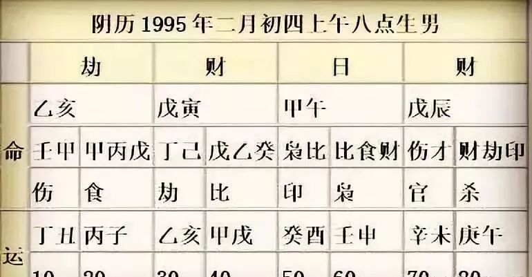 阴年生男例:阴历 1995年二月初四上午八点生男。四柱及所透十神、藏干、所藏十神同上,而大运以月柱戊寅为准排,起运数与大运同步逆计,每步运十年一递增: