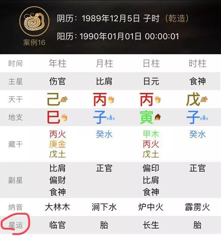 下面这个例子中画红色圈的“星运”,就是我们今天要研究的四柱中的十二长生。