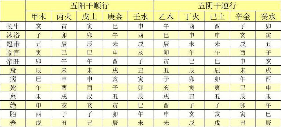 这张表是十天干对应十二地支的十二长生表。根据对照表,我们很能快速知道,我们需要预测的四柱所对应的十二长生分别是什么。
