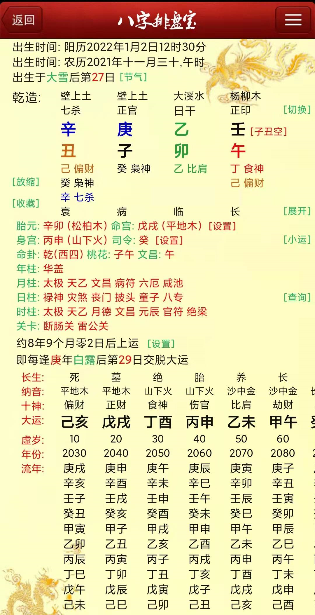 排盘过于简单的命盘示例上图除了比前面的排盘软件的界面更清晰之外,最重要的是,在八字命盘宝排出的命盘里,很清晰地用颜色区分了五行。黑色为水,绿色为木,红色为火,黄色为土,蓝色为金。