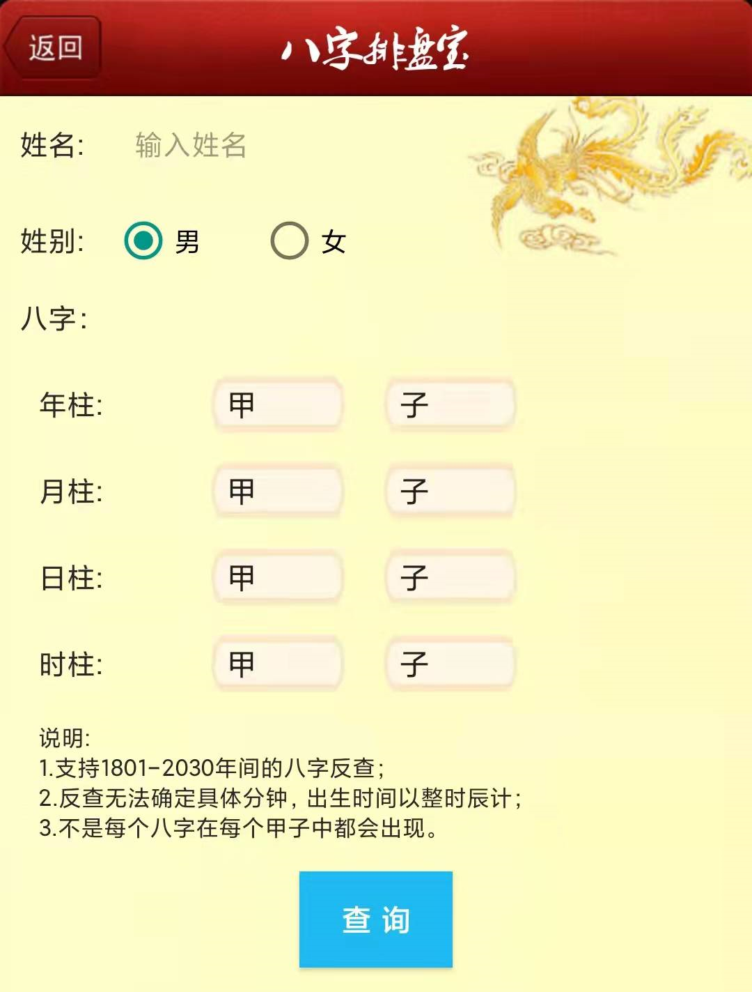 第二是在的备注里标注。只需要标注八个字就可以了,以后需要查询详细信息时,用软件的“八字反查”功能(下面是八字反查的界面,按年月日输入年柱、月柱、日柱、时柱,就可以得到准确的八字命盘。