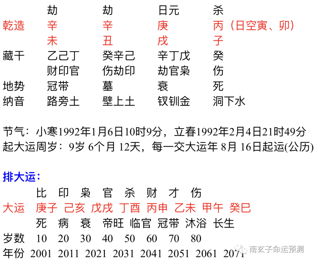乾造:辛未年,辛丑月,庚戌日,丙子时(寅卯空)