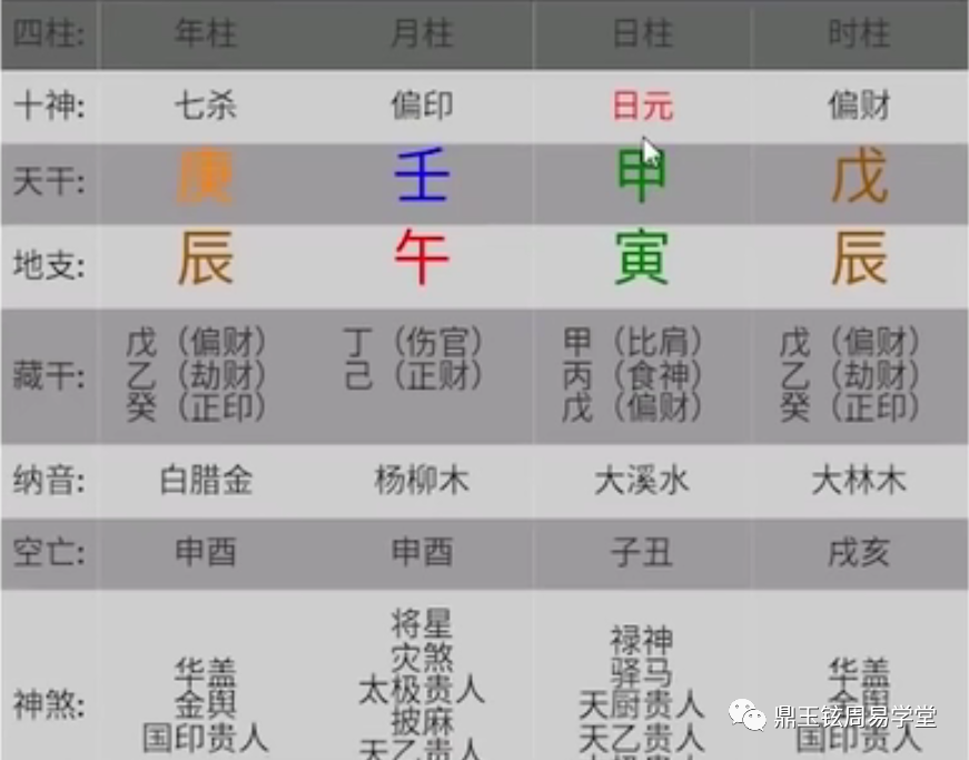 首先通过出生年月日时,分男女进行八字排盘(可通过网页或者手机软件)。例如排出的八字如图,来分清日元强弱, 上图中有四柱,每柱有天干、地支,四柱八字由此而来,上图中日柱上边的字——“甲”也叫日元,这个字代表自己,看八字就是看其他七个字和自己是什么关系,五行是相生还是相克,这七个字的能量是不一样的,首先看月支——“午”,又叫月令,能量最大,决定八字能量的强弱,月令占40分,月干占12分,日支占12分, 时干和时支分别占12分,因为这几个字离日元比较近,所以能量得分会高一些,年干和年支得分就要少一点,年干占8分,年支占4分,日元“甲”为木命,月令“午”为火,木生火,要消耗木的能量,则要减去40分,如果月令是生日元或与日元相同,则加40分,其他位置则依次按照五行相生相克的原理去计算,以50分为界限,高于50分为身强,低于50分为身弱。