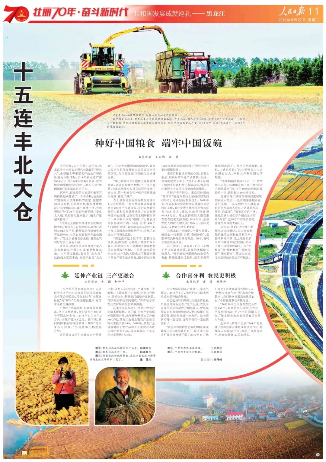 新中国成立以来,黑龙江累计为国家提供商品粮1万多亿斤;国人每吃9碗饭,就有1碗产自黑龙江……历经七十载春秋,黑龙江的农业已发生翻天覆地之变:2018年全省粮食总产量1501.4亿斤,实现“十五连丰”,连续8年位居全国首位。