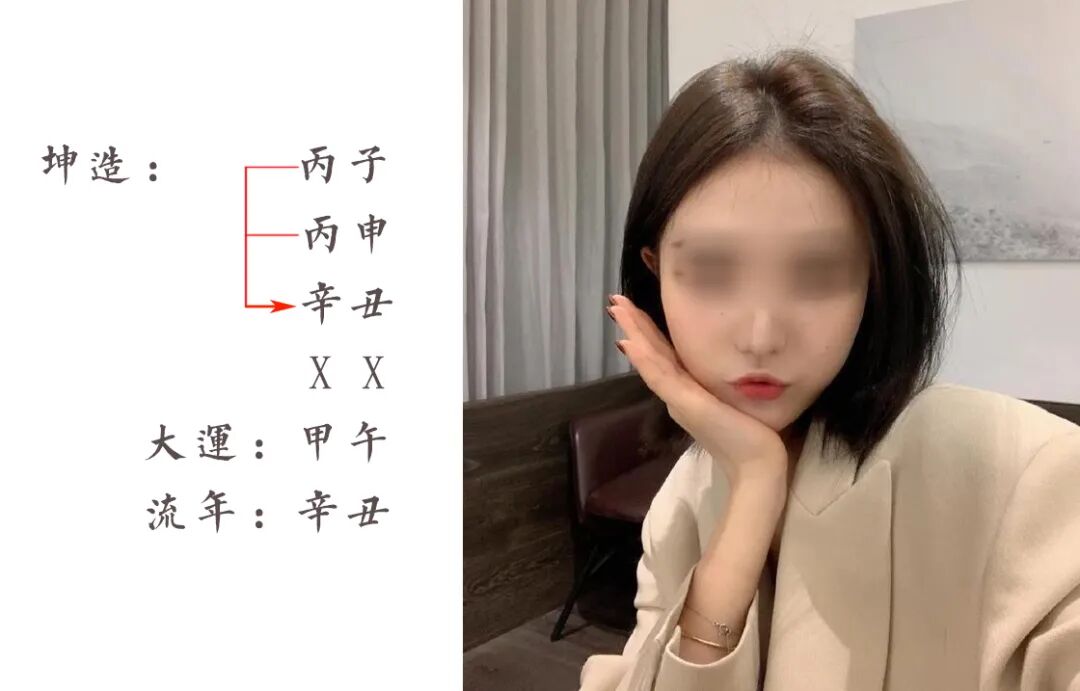 我相信对于任何一个有八字基础知识的小伙伴都一眼就能看出,坤造的辛金日元,年、月天干两个丙火来合克日元,就是二男争妻之象,至于两个男人分别是什么状态仔细一推也能略知一二,而她会选择哪一个也是一目了然。辛丑2021年,与日柱婚姻宫伏吟,流年为比劫夺官之年,这个婚能顺顺利利结才怪。