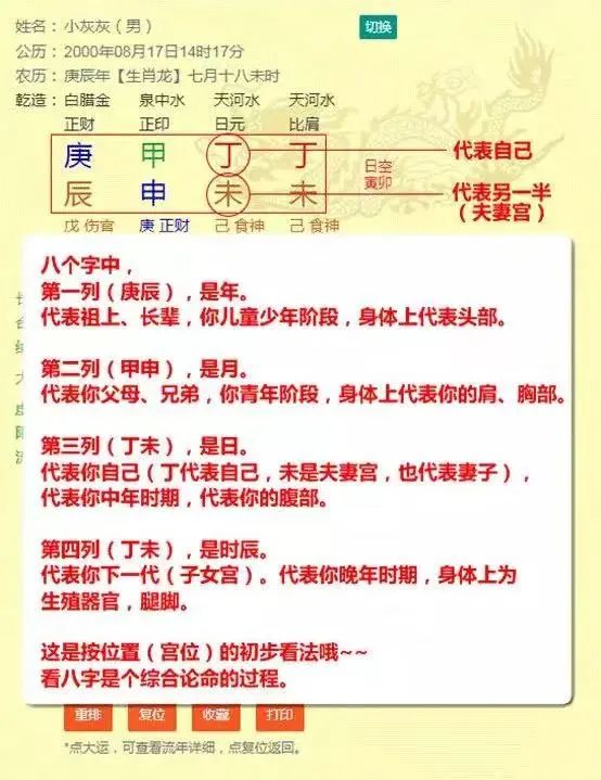 以下是我从网络排盘系统截下来的一个八字命盘简盘。让我们先来认识一下: