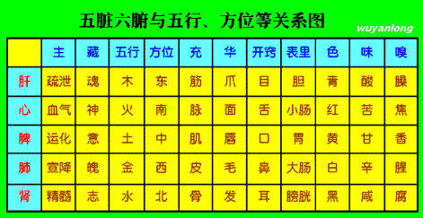 肺,五行属金。同类为:西方,秋天,大肠,鼻,涕,腥(气味),皮肤与毫毛,悲,辛辣,白色,水稻等五行都属金。更多请参见:阴阳五行类聚肾,五行属水。同类为:北,秋,膀胱,耳,唾,腐(气味),头发,恐惧,咸,黑色,豆类等五行都属水。 肝,五行属木。同类为:东,春,胆,眼睛,泪,臊(气味),爪(指甲),怒(生气),酸,苍色,麦类等五行都属木。心,五行属火。同类为:南,夏,小肠,舌,汗,焦(气味),面(脸),喜,苦,赤色,黍等五行都属火。 脾,五行属土。同类为:中,长夏,胃,口,涎(口水),香(气味),思,甘(甜),黄色,稷等五行都属土。