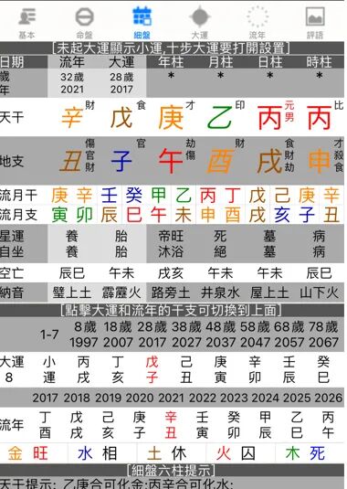 日元丙火,生在酉月,地支有午,戌,天干有乙,丙。原局火金基本趋于平衡。碰到这样的八字,选取旺衰用神的时候,一定不能死板。要跟着大运和流年走。大运走木火运,流年用神就要用金水。大运走金水运,流年就要用木火。