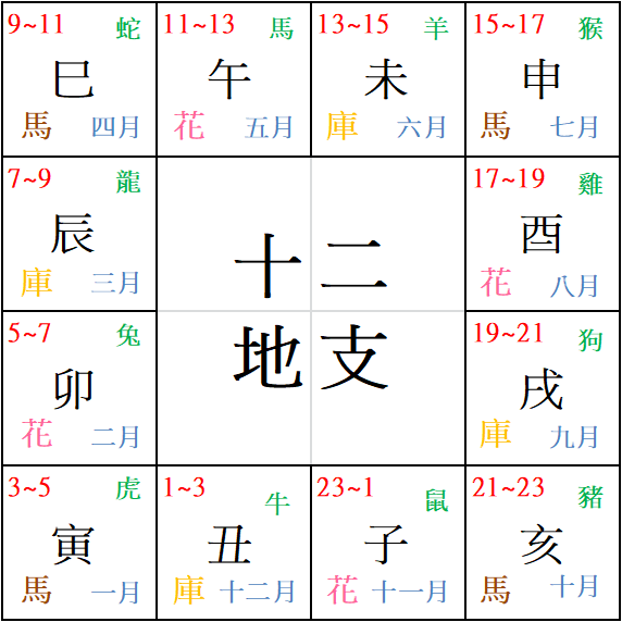 步骤C丶从出生时间看,你是几点出生的?参考上图左上方红色的字体,找出你的出生时间。并对照同一格黑色的字体。例如,你的出生时间是下午13~15点,那么你的出生时辰八字就为「未」。
