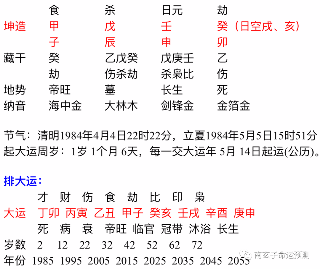 坤造:甲子年,戊辰月,壬申日,癸卯时(戌亥空)