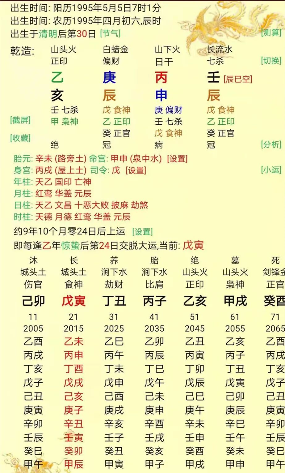 6、癸巳运,甲申年结婚,丙戌年离婚,财神为辰、未浊象,据命主所述,是妻子在吵架时,骂他的母亲,命主动手打了妻子,逢戌来冲,动了妻宫,丙戌太岁流年,丙与辛合羁绊,戌与酉穿穿去官星禄神,这一年命主不受任何控制,最终离婚。