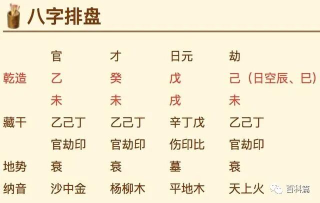 上面的例子中,乙木克戊土,可我者为官,乙为阴,戊为阳,阴阳属性相反,则为正官;我们再来看一个地支戌中藏辛金,戊土生辛金,我生者为食伤,辛为阴,戊为阳,阴阳属性相反,则为伤官;其他以此类推,这样八字我们就排出来了