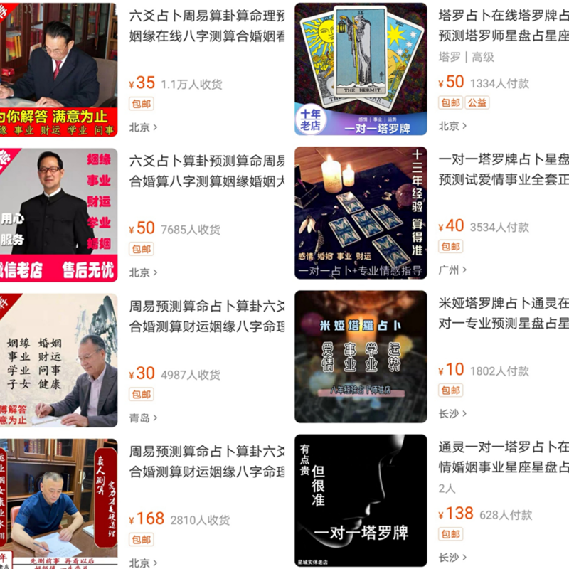 在淘宝搜索“算命”,会跳出来很多结果,销量最高的店铺,月销订单可达两万以上,以最低的客单价计算,每年店铺流水也有千万级别。小欣告诉全现在,她每次去淘宝算命都会“货比三家”,曾经照顾过很多店铺的生意,并且还去过线下的“塔罗屋”。