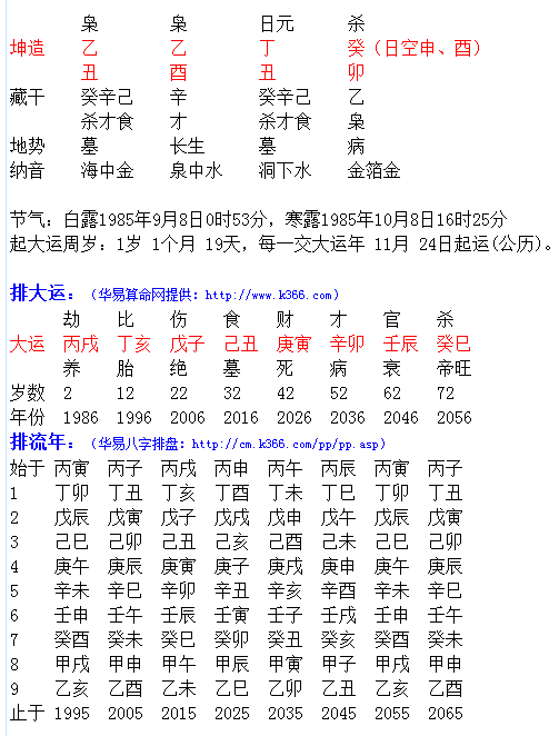 命主此运生助和克耗泄的力量几乎平衡,所以身体一般,没有大灾 。癸水在时柱为足,所以腿脚会有不适,癸水也代表肾功能,所以有肾病之忧。丑土本来就弱,子水合绊,所以脾不好,脾寒,实际正是如此。此人前来求测时,也正是治疗脾寒。卯木主肝,所以肝功能也差。卯木在时柱为腿,腿脚不利。下面详批一下流年。
