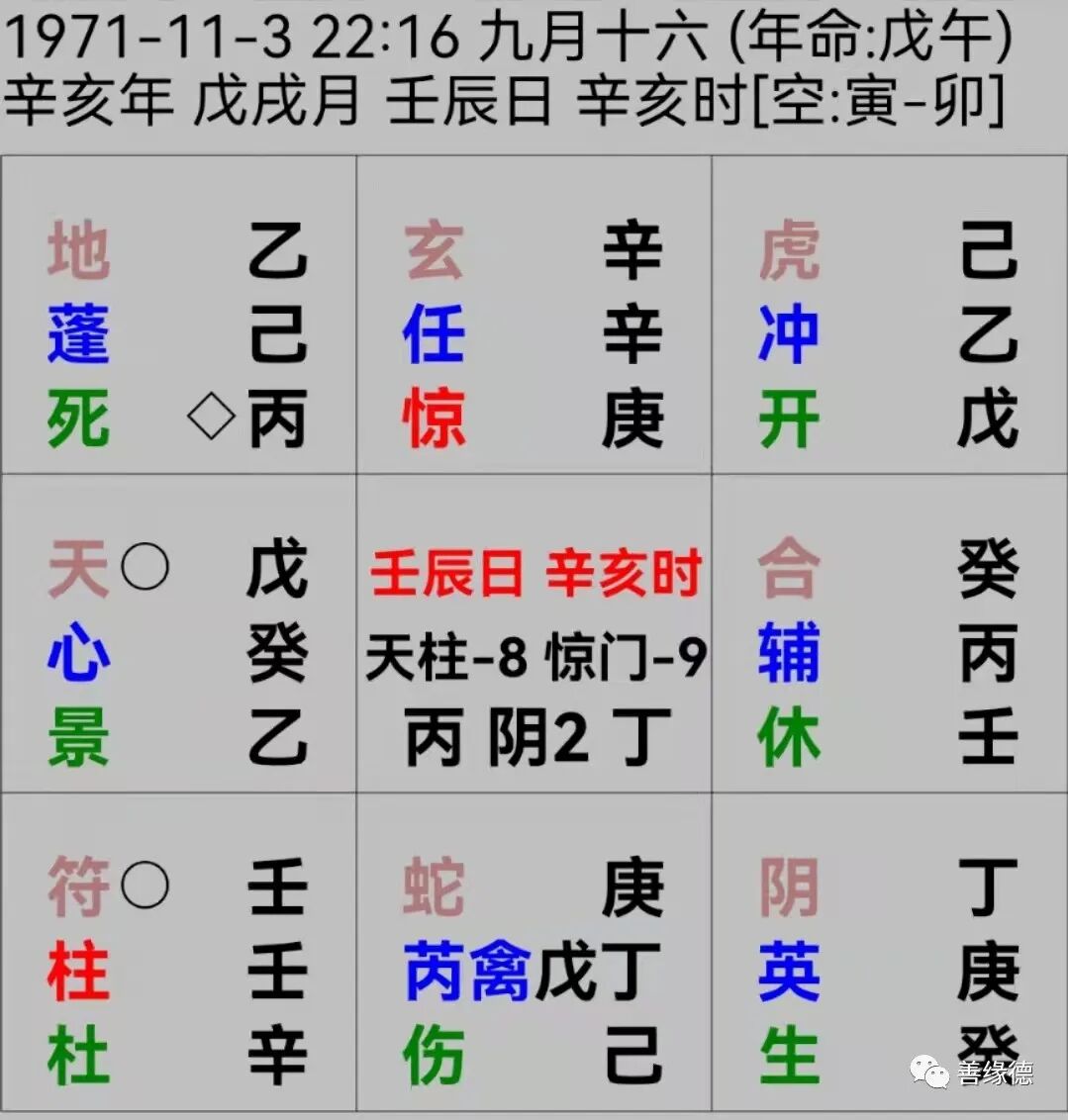 这个八字命盘,我就看了一个信息,离:指使门惊门,年干辛金午午自刑