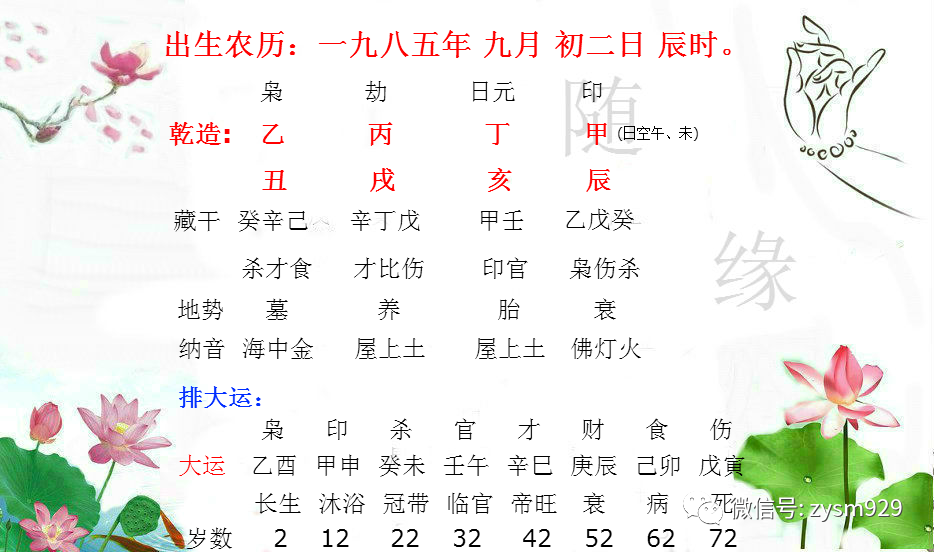 八字乾造:你生于乙丑年、丙戌月、丁亥日、甲辰时(日空午、未);2岁起运:乙酉;海中金命人,每十年逢立秋之后转运,现在走在32至42岁的壬午大运中。