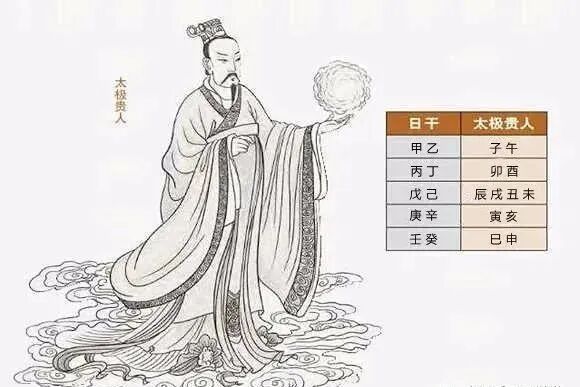 太极贵人甲乙生人子午中,丙丁鸡兔定亨通,戊己两干临四季,庚辛寅亥禄丰隆,壬癸巳申偏喜美,值此应当福气钟,更须贵格来相扶,候封万户到三公。太极贵人查法同天乙贵人。但无胎元,命宫之说。三命通会曰:太极者,太初也,始也,物造于初为太极,成也,收也。物有归曰极,造化始终相保。乃曰太极贵人也。甲乙木造乎子,坎水而生,后终乎午,离火焚而死,丙丁火,先喜出乎震,卯也。后喜藏乎兑,酉也。庚辛金得寅,乃金生乎艮,见亥乃金庙乎乾。壬癸水先得申而生,后得巳而纳。太极贵人,人命逢之,主聪明好学,有钻劲,喜文史哲宗教等科目。为人正直,做事有始有终。如得生旺及有贵格吉星相扶助,主气宇轩昂,福寿双全,富贵人间。