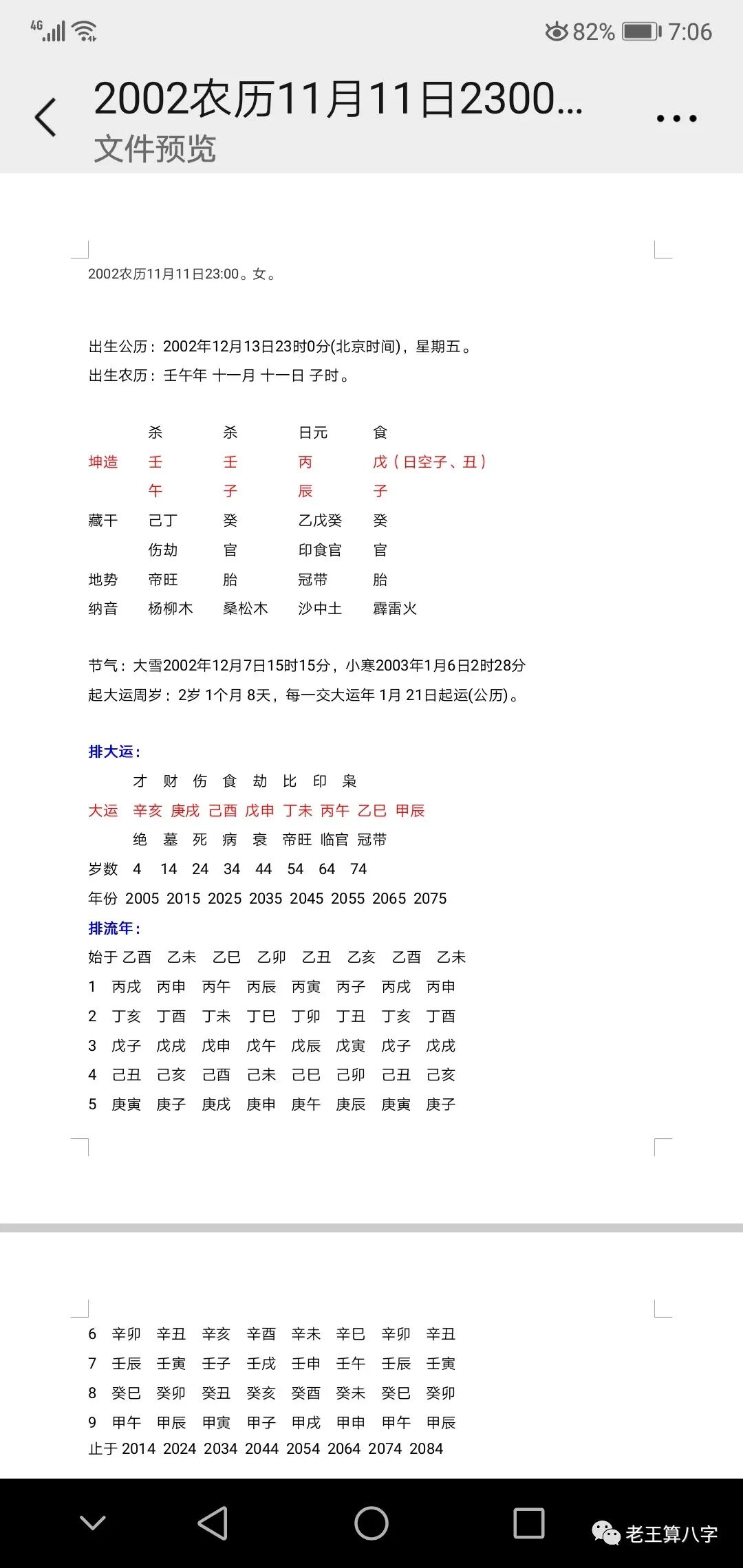 一,分析八字日干旺弱日干为丙火代表命主,生在冬天子水月令,冬天水旺火弱,故八字身弱。八字讲究五行平衡,身弱喜生扶,木火能生扶日干丙火,故木火为用神。身弱不喜再逢克泄,土金水能克泄日干丙火,故土金水为忌神。二,分析命主学业情况丙火代表命主,生在冬天水旺的季节,八字一片旺水克了日干丙火。水为官杀,求学期间官杀代表学习压力,八字身弱忌神官杀克身,八字水旺水多,故学习压力较大。最需要有木来泄水生火旺身,缓解一下学业压力。木为印星,印星代表文化知识教育等,但命主八字五行没有木,缺少印星,故在学业上压力没法缓解,导致压力会越来越多,也会影响到你的学业成绩,因此就要放松心情,轻装上阵,才能考出更好的成绩来。结合大运、流年运势来看,八字忌神有制,且代表学业成绩的印星在流年到位,所以命主今年考运特好,所以不要紧张,一定能如愿考入大学。八字身弱,喜木火助身为用神,木为东方,火为南方,故求学方位东方或南方对你会更有利。三,分析未来事业工作及财运情况印星为印章,故印星也代表权利,但命主八字没有印星,故命主未来不太适合走仕途之路,没有官运。财运看财星,财星代表钱财和经济,财星五行为金,但命主八字五行也没有金,缺少财星,且八字身弱也有不担财之象,所以未来也不太适合经商或自主创业。八字水势较旺,水为官杀代表工作及约束,为不自由之象,故命主未来更适合上班求财。木火为用神,故更适合到东方或南方,上班发展对你会更有利。借助平台或一个好的单位的优势,来发展自己,会更好。在行业选择上,围绕五行与木火相关的行业,去选择对你会更有利,因为木火是你的用神之故。结合大运来看,一路旺身担财官大运,故一生也会衣食丰足,钱财不缺,虽不能大富,但过小康生活也会绰绰有余。四,分析命主未来婚姻感情情况女命看婚姻,一看官星代表丈夫,二看日支夫宫为丈夫的宫位,看二者在八字中的状态如何,就能知道命主的婚姻感情情况。官星为水代表丈夫,命主生在冬天水旺的季节,官星很旺克身,官星为忌神,故命主一生来自丈夫和来自婚姻方面的压力很大,所以命主未来不太适合早恋早婚,适当晚婚对命主会更有好处。八字年月时共有四个官星,官星代表丈夫,而现实生活中的丈夫只有一位,所以命主未来在婚恋方面会坎坷较多较多,故要多加,尽量不要早恋早婚,否则压力大,烦恼多,也会影响到你的学业。日支夫宫坐了辰土,辰土为水库,八字身弱忌辰土泄身,夫宫也没有发挥了很好的作用。八字身弱,忌官杀克身,最喜有木官杀入身,化忌为用,木为印星,就能化官杀生身,木为东方,故命主未来找对象是东方的,婚姻方面对你会更好。命主的八字,夫星和夫宫在八字中的状态并不好,故命主未来在婚姻方面,就要少欲少求,不能执着,一生才会有更幸福美满的婚姻。五,分析未来子女情况看未来子女情况,一看食伤星代表子女,二看时柱为子女的宫位,看二者在八字中的状态如何,就能知道命主未来的子女情况。辰土为食神,食神为女儿,且命主八字只有一个食伤,故命主未来就只有一个女儿之命。辰土为湿土,在冬天水旺的季节,辰土较旺,子女星旺,说明未来子女前程无忧,有发展前途。时柱为子女的宫位,坐了壬子官杀,官杀代表丈夫,丈夫坐子女宫位,说明命主未来有未婚先孕的情况,或当年结婚当年生孩子之象。辰土为女儿,辰土为水库,能纳水制水,对八字起了很好的作用,说明命主女儿孝顺,是不错的孩子,也说明命主未来能享子女之福。六,分析身体健康情况八字讲究五行平衡,五行过旺或过弱都有不利身体健康之象。命主八字水势过旺为忌,水代表妇科泌尿系统方面问题,过旺不利,故这方面要多加注意。命主八字五行水旺冲克午火,火代表经血眼目肠道及心脑血管方面问题,火弱不利,故也要多加注意。只要命主平时多加注意,积极做好预防就不会有什么大问题,也没有意外灾祸发生,会平平安安一生。七,分析大运运势14-24岁走庚戌大运,大运庚金生旺壬忌神官杀,有力克身,故命主在这个大运里学习压力比较大。但是运支戌土为燥土有力克制了忌神旺水,忌神有制,有利升学,所以命主在学业上也不必担忧,只要好好努力,也一定要考出如意的成绩来,故考入大学不成问题。24-34岁走己酉流年,在这个大运里正好是工作和成家立业的阶段,运支酉生旺子水官星克身,各个方面压力都比较大,且辰酉相合,辰土为用神逢合也有不利,所以这个大运运势平平,故在各个方面就要少欲少求,随顺就好,减少烦恼,让生活过的越是平淡,则则越会幸福。34-44岁走戊申大运,运支申金与八字构成申子辰三合水局,水旺压力较大,不论是是有事或没有事,你都会自寻烦恼,也会容易导致不利身体健康之象,所以在这个大运里更要稳打稳扎,不要强求和冒进,这个才会对各个方面都会更有利。44-54岁走丁未大运,为火土旺的大运,火能助身,土能克水制忌神,故这个不论是事业工作及财运还是家庭,各个方面运势都会有好转,所以命主也有先苦后甜之象,所以一定要好好珍惜和把握,一直到晚年运势都不错,虽然来得晚了一些,但是能有好的大运出现,也说明命主为有福之人,则晚年更会大吉大利。八,分析近期流年运势今年是壬寅流年,寅木为印星,印星代表学业也代表考运,八字身弱,最喜有印星生身,今年印星出现,考运特好,所以命主一定要放下包袱轻装上阵,一定会