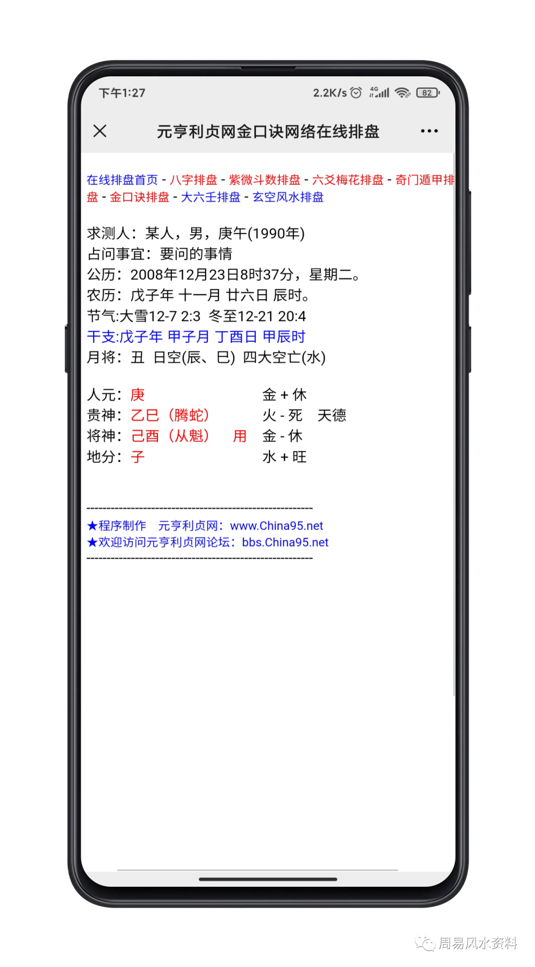 元亨利贞网是综合性易学研究和在线算命门户网站。本网站可以进行在线免费排盘:包括八字排盘、紫薇斗数排盘、六爻梅花排盘、奇门遁甲排盘、金口诀排盘、大六壬排盘、玄空风水排盘。
