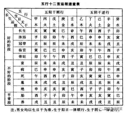 在四时运行的规律中,以天干五行代表的一切事物也都有生、旺、死、绝等十二种不同的状态。这就是众所周知的天干寄生地支十二宫;又称为“生旺暮绝”、或长生帝旺"或“长生十二宫”。