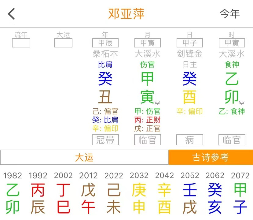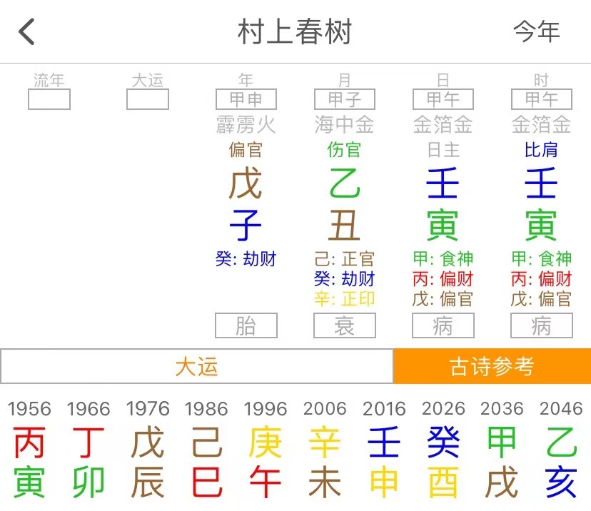 格局非常简单【伤官合杀】,之前的文章《是什么让村上春树都“提笔忘字”?》已经分析过类似的啦,就不重复讲,只需要知道她很强就对了。