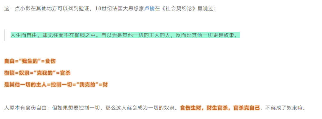 体育精神、教育精神、哲学精神、民主精神、启蒙运动精神、法国浪漫主义文学精神……这一切,都可以统称为“卢梭精神”,小影总结为“比劫食伤精神”。