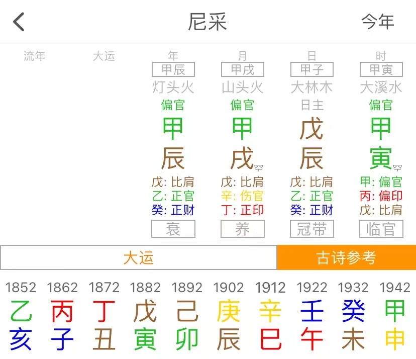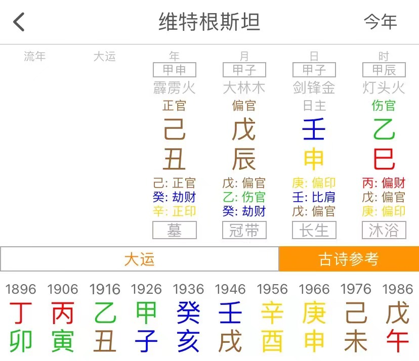 这也是为什么尼采、维特根斯坦这样比劫旺,食伤弱的人,一上战场就“拉稀”的根本原因,实战能力几乎为零。(前文阅读《不天才,毋宁死》《杀旺无制是一种怎样的体验?施/受虐者的八字竟然惊人相似!》)