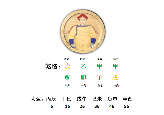 好在年少时期他走在了用神丙辰的大运上,所以6岁登基,但开始却是个有名无实的皇帝,摄政王多尔衮把持了很多年的朝政,而他与生母孝庄的关系也不怎么好,这里面固然有年纪尚小的缘故,但也是丙辰大运的因由在,因为辰为水之墓,水是顺治的印星,我们之前讲过,印主母亲,主学业,在这里多加一条,也主权利;水入墓,也就是印进入了坟墓,自然发挥不了他的作用,何况他命里本就无水,就更是雪上加霜了。