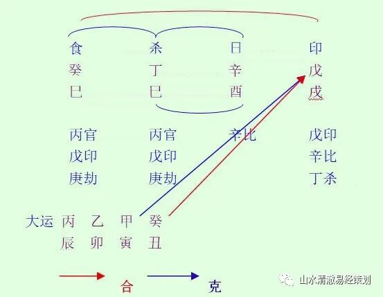 金生在阴历的4月,火非常的旺。火生土,土生金,金不弱。丁火克辛金,巳火克酉金,要用癸水克掉丁火,让戊来把癸水合掉。让癸水没有作用。所以大运走甲寅的时候,甲把戊土克掉,癸水就克丁火。真正的结果,说调侯也可以,说泄秀也可以。火生土,土生金,金旺用水来泄。在甲寅运时才能办得到。