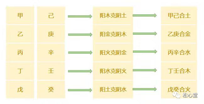 先说合化的前提。古人讲究阴阳和合,既然是和合,一定是阴阳相合,阳阳、阴阴均不能合化。其二,有克才有合。天干合化一定是二者相克进而化出其他的,这就像夫妻两口子打架,打着打着反而打出了共识,这个共识有可能是其中一方的,也有可能不是他们二人任何一个识,反而是另外的将二人关系给调和了的识。我们来看一下十天干:甲乙丙丁戊己庚辛壬癸,阴阳相克的有哪几个: