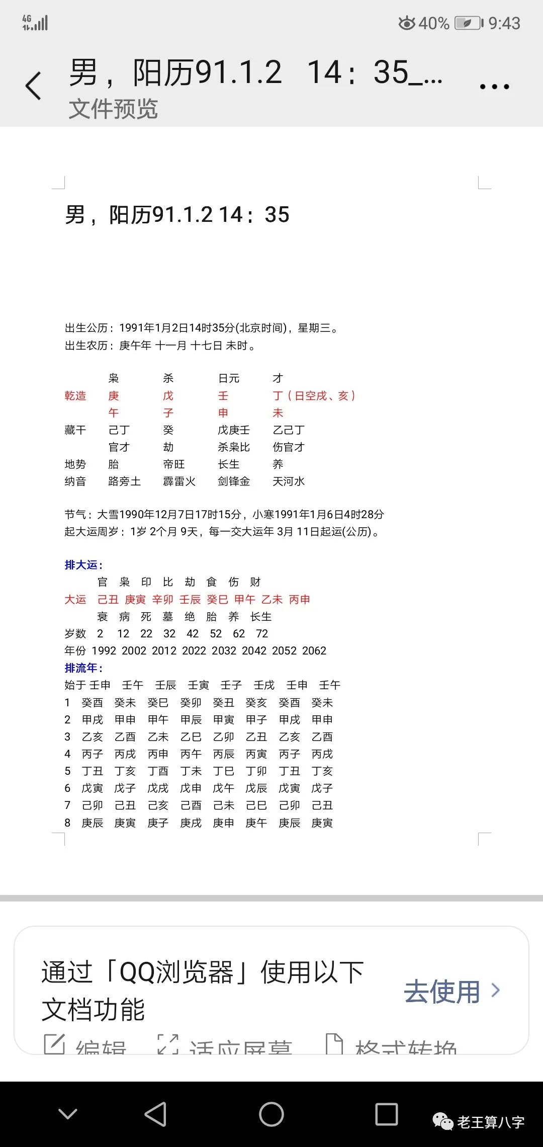 一,分析八字日干五行旺弱日干为壬水生在冬天,冬天水旺故八字身旺。八字讲究五行平衡,身旺需要抑制,木火土能够抑制日干壬水,故木火土为用神。身旺不喜再逢生扶,金水能生扶日干壬水,故金水为忌神。二,分析事业财运命主八字身旺,身旺则能担财官,财为养命之源,官为护身之本,命主八字身旺,则有利于求财官,有利于命主未来事业的发展。年月有子午相冲,冲则有动,年代表命主的家乡,子午相冲则说明命主更适合离开家乡外出求财发展事业。时干丁火为正财,正财代表工资之财,丁壬相合,正财合身,说明命主未来更适合上班求财,为靠勤劳致富之命。八字年月有子午相冲,日时有丁壬相合,年月代表早期,日时代表后来,八字先见冲,而后见合,说明命主早期工作事业多不稳定之象,丁壬相合则说明后来事业工作才会更稳定。印星代表文化知识及学历,八字日支申金为印星,故申金就代表学历。八字日干为壬水代表命主,生在冬天水旺的季节,水势过旺有泛滥成灾之象,故不喜申金再来助身生水,生旺忌神,故申金印星也是忌神。申金在八字没有发挥好的作用,申金为印星代表学历,申金为忌神,故建议命主没有必要再去提升你的学历,因为你的八字印星为忌神之故。今年是壬寅流年,流年寅木为驿马,驿马代表动,所以命主今年很适合工作变动,可以选择跳槽是比较好的机会,故要好好把握。八字身旺,喜木火土抑制日干壬水平衡八字,木为东方,火为南方,土为四隅方位,以命主的出生地为中心点到以上方位发展求财或跳槽对你会更有利。木火土为用神,故在职业上围绕五行属性木火土的行业去选择会更好。五行属木的行业如文化界,文艺界,文具用品业,文化用品业,文人,作家,抄写员,教师,教育用品业,书店,出版业,印刷业,公共事务业,司法界,治安警界,政治界,众议员,花卉业,花店,植物栽种业,生物工程业,木材,木器业,室内设计,设计师,绘图员,家具业,装修业,纸业,竹业,种植业,树苗业,药物业,医院,医疗业,学校,布业,佛具店,宗教用品店,香料店,宗教业,素菜馆,商务中心。五行属火行业如下饮食、饭店、宾馆、工厂、百货、美容、光学、照明、照相、眼镜、电力、电器、爆竹烟花、冶炼、易烧易燃的油类酒精类、理发、化妆品、人身装饰品,高热性、火药性、光亮性的行业、灯具、易燃品、油、瓦斯、食品、热食、电镀、易燃烧性质、厨师。热度性质、火燥性质、加工修理性质、易燃烧性质、放光、光学、高热、液热、易燃烧物、热饮食界食品界等。手工艺品,机械加工品、制造厂。灯饰、电器、电焊、电焊、燃料、石油、电子、美发美容、化妆品、烧烤、精品、蜡烛、爆竹、火药、照明、光学、照相、眼镜、百货、音响、KTV、通信、微波通讯保险业、礼品、热饮、广告、电影、电视、歌舞艺术、绘画等。五行属土行业有房地产、建筑业、土地买卖、工程、陶瓷、石材、石灰、筑堤、水泥、砖瓦、砂石场、拆除业、农业、畜牧、古董、珠玉、代理商等。土产或地产性质、农作性质、畜牧性质、大自然原物性质、中间人之性质、售现成菜类、售现成农作物、杂谷、米、麦、畜牧兽类、牧牛羊或养鸡猪等、售饲料界、所有农畜界百业、房地产买卖界、房屋买卖业、防水事业、雨衣、雨伞、雨帆、筑提防、容水器物、当辅、古董家、鉴定师、制糊或售糊业、所有中间人、介绍业、代书、律师、说客、法官、代理、酒店管理、管理业、管家管理、护理员、代替、买卖、设计、顾问、秘书、附属品、附属人、领导事业、领导性质、人才事业、防水事业、农人或土壤研究者、大自然原物售卖界、石头、土地山地、水泥等、建筑界等。三,分析大运运势32-42岁走壬辰大运,为水旺的大运,八字本身水势就很旺,再见大运再来助水,则有水势泛滥成灾之象,不利事业工作及财运,所以命主在这个大运里一定要合理规划安排,要少欲少求,要脚踏实地,一步一个脚印的稳步向前发展会更好。42-52岁走癸巳大运,为旺的大运,火为财星代表钱财和经济,八字身旺有担财能力,大运见财,很利事业工作及财运,所以一定要好好把握住机遇,好好发展一下自己的事业工作及财运,就一定会有不错的收获。52-62岁走甲午大运,也是火旺生财的大运,也很利事业工作及财运。但是大运午火引动八字子午相冲,事业工作及财运也会有不稳定之象,命主在这个大运里也会有退休之象。子午相冲,也要多加注意身体健康才好,只要平时多加注意,积极做好预防,也就没有什么大问题。62-72岁走乙未大运,大运未土引动八字子未相穿,也有不利身体健康之象,故命主晚年要多加注意身体健康才会更好,一定要积极做好预防,才会更能长命百岁。四,分析近期流年运势今年是壬寅流年,寅木为驿马,驿马代表动,故今年会有工作变动之象。且流年寅木去冲八字申金印星,印星也代表单位,冲则有动,所以命主今年更适合跳槽,工作变动也有快马加鞭之象。明年是癸卯流年,八字身旺水旺为忌神,喜木旺泄水,忌神有制,癸卯流年木旺泄水起了很好的作用,所以命主命主事业工作及财运比较稳定,所以只要如理如法积极努力去追求,就一定会有不错的收获。后年是甲辰流年,流年辰土与八字构成申子辰三合局,又是三合水局,使八字水势更旺,不利事业工作及财运,故要多加注意才好。2025年是乙巳流年,为火旺的流年,火旺财旺,有利求财,