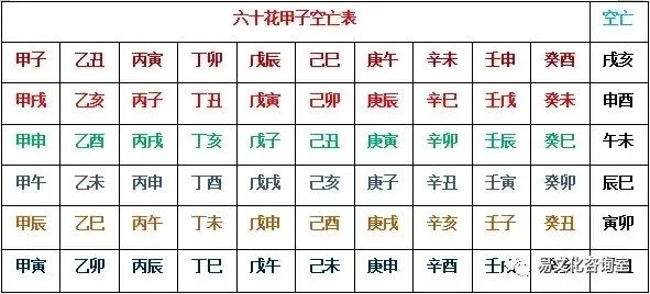 空亡顾名思义,即没有、消失之意思。甲子旬中无戌亥,戌亥则是空亡;甲戌旬中无申酉,申酉则是空亡,六甲类推,空亡柱中吉减吉,凶减凶。四柱预测以年柱及日柱对照其余三柱地支,而得知何柱空亡。下面会说明空亡的种种命理作用、影响等等。