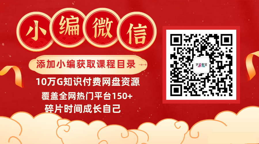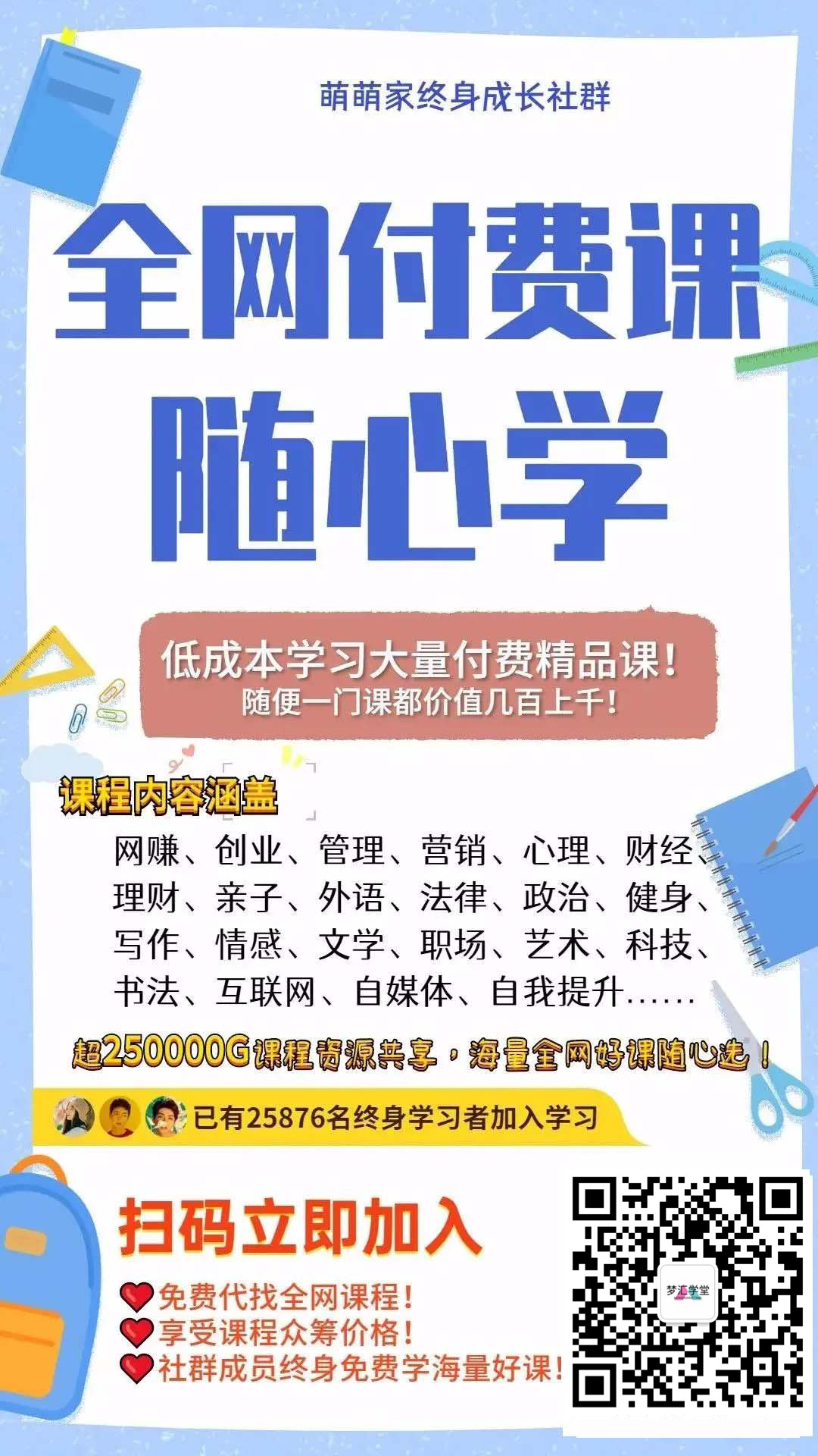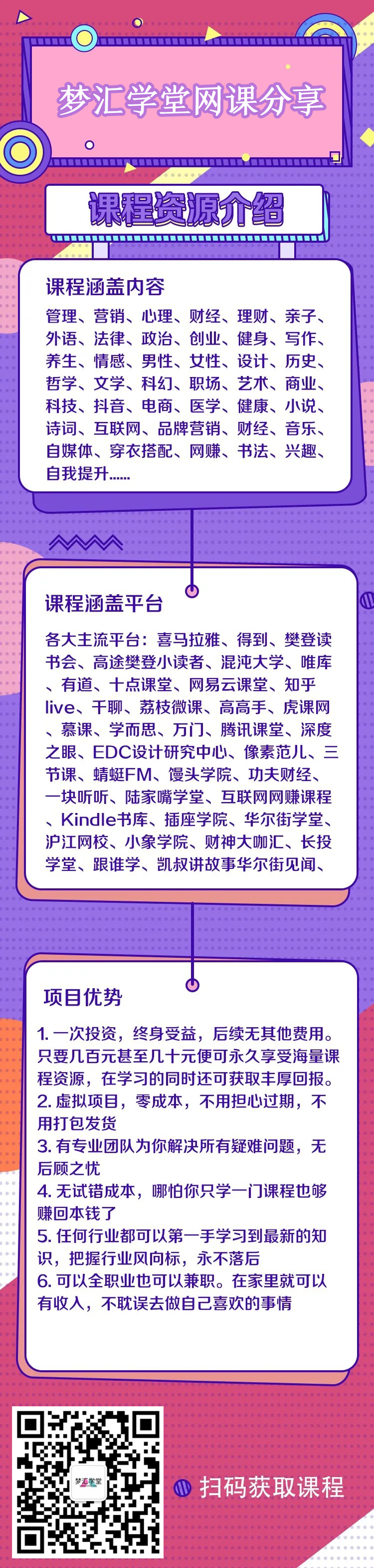 各平台热门网课: : 亲子、IT、人工智能、UI/插画/平面/3D等设计、心理、启蒙/小学/初中/初中/高中热门网课、考研、考证、 法律、英语、中医、会计、网赚营销、抖音快手、创业、医学、 养生、兴趣、健身、理财、协作、演讲、艺术、文学、小说、职场、电商等等 。 视频、音频、PDF百度网盘分享。 请扫下方二维码获取课程 !