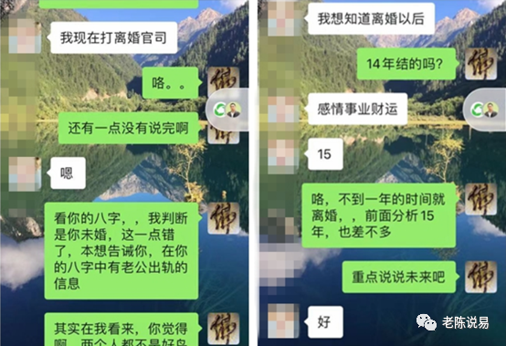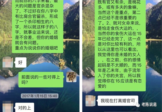 从上面的聊天记录可以看到,我认为她仅在2015年有恋爱,而实际上2015年结婚,结婚不到两年,正在打离婚官司,这也是这位女生找我看八字的原因。当然从上面的反馈来看,这位女生的事业还是不错的,而且从她走的大运来看,就其事业方面一直会是不错的。