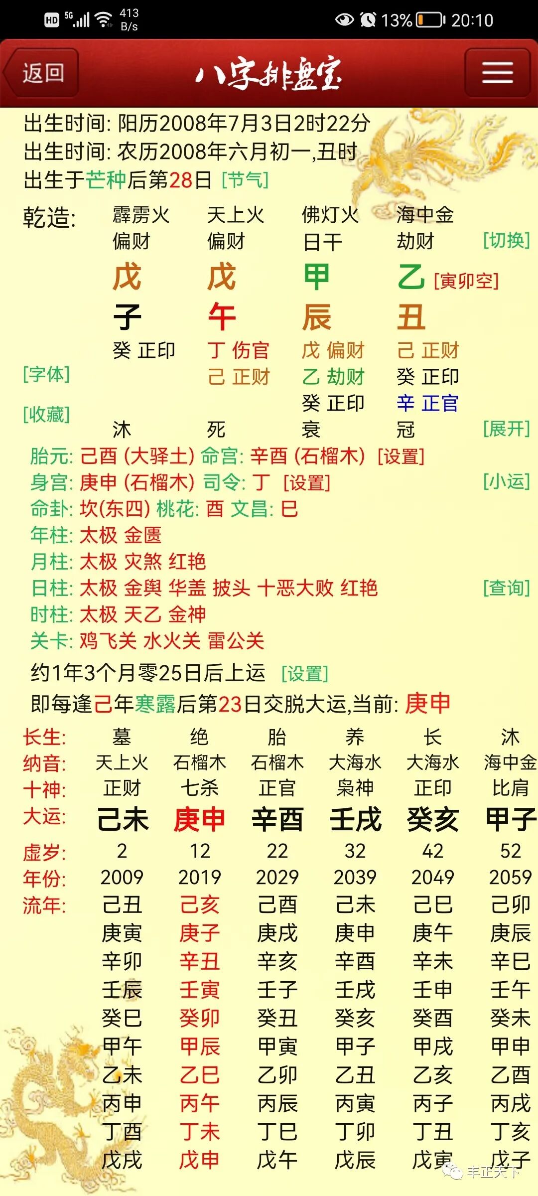 断:这个孩子其实挺聪明的,不用担心。他就是贪玩,自制力差。走上社会没问题的。学业这一块的话就是不用太计较。到社会上去是一把好手。学习这块就也别太在意,随他。他头上脸上容易留疤。婚姻很好,就是好的太好了,有可能就是娶了媳妇忘了娘。就婚姻还是不错的,事业也不错,应该是个有钱人。(就拿到八字一口气说了这些的,对方还没问学习、身体、婚姻等)