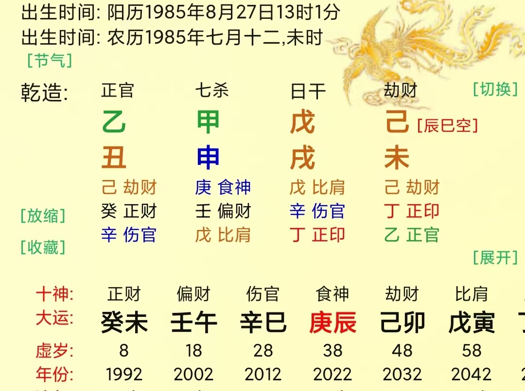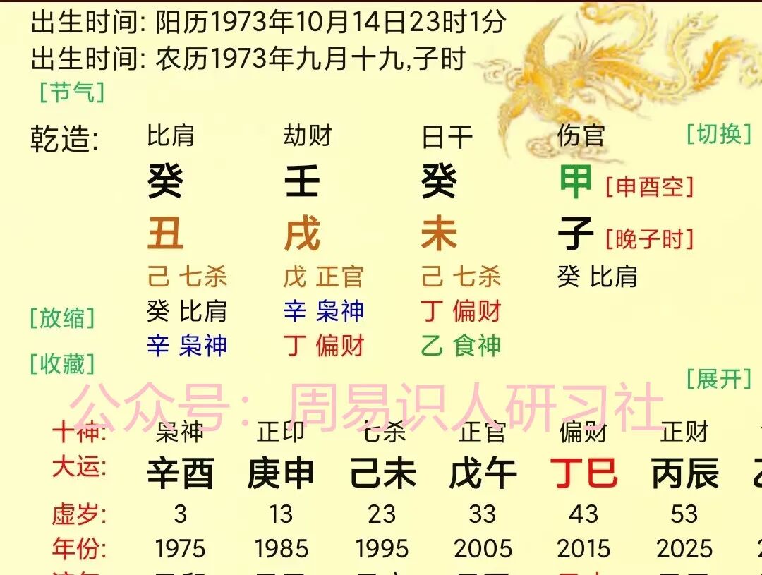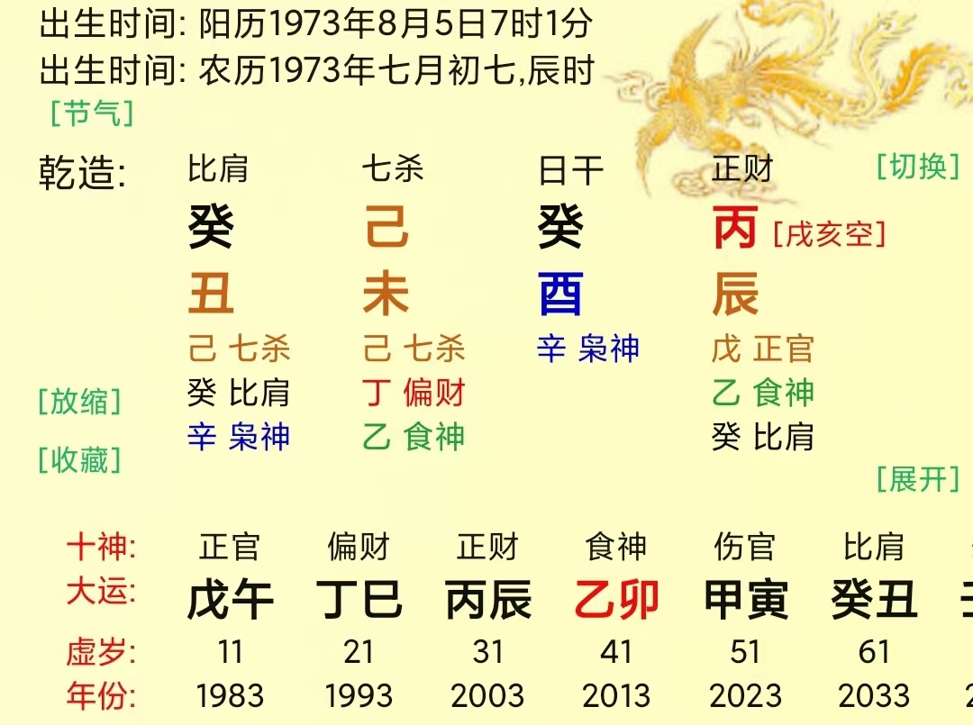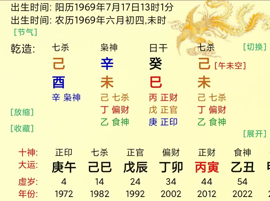 大运乙亥,寅亥合为木,木稍具气势具有反叛(自成体系)之心。流年丁丑,丑未冲开墓库,因此命主该年患胆囊炎。