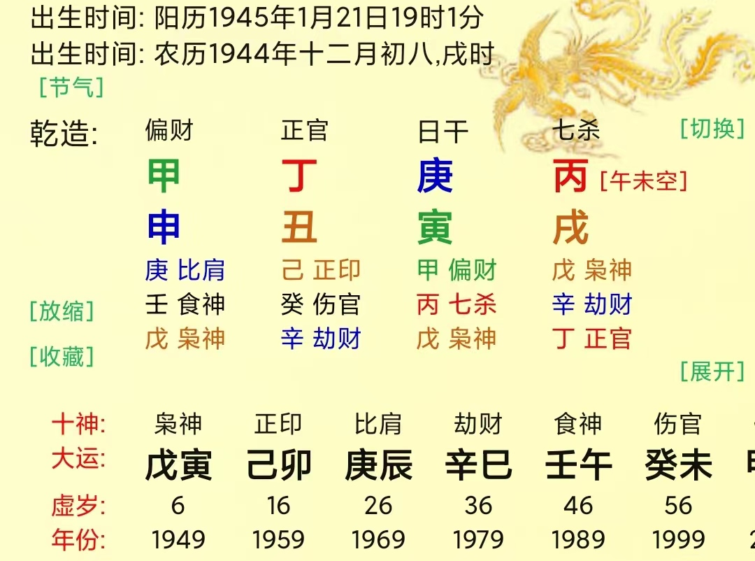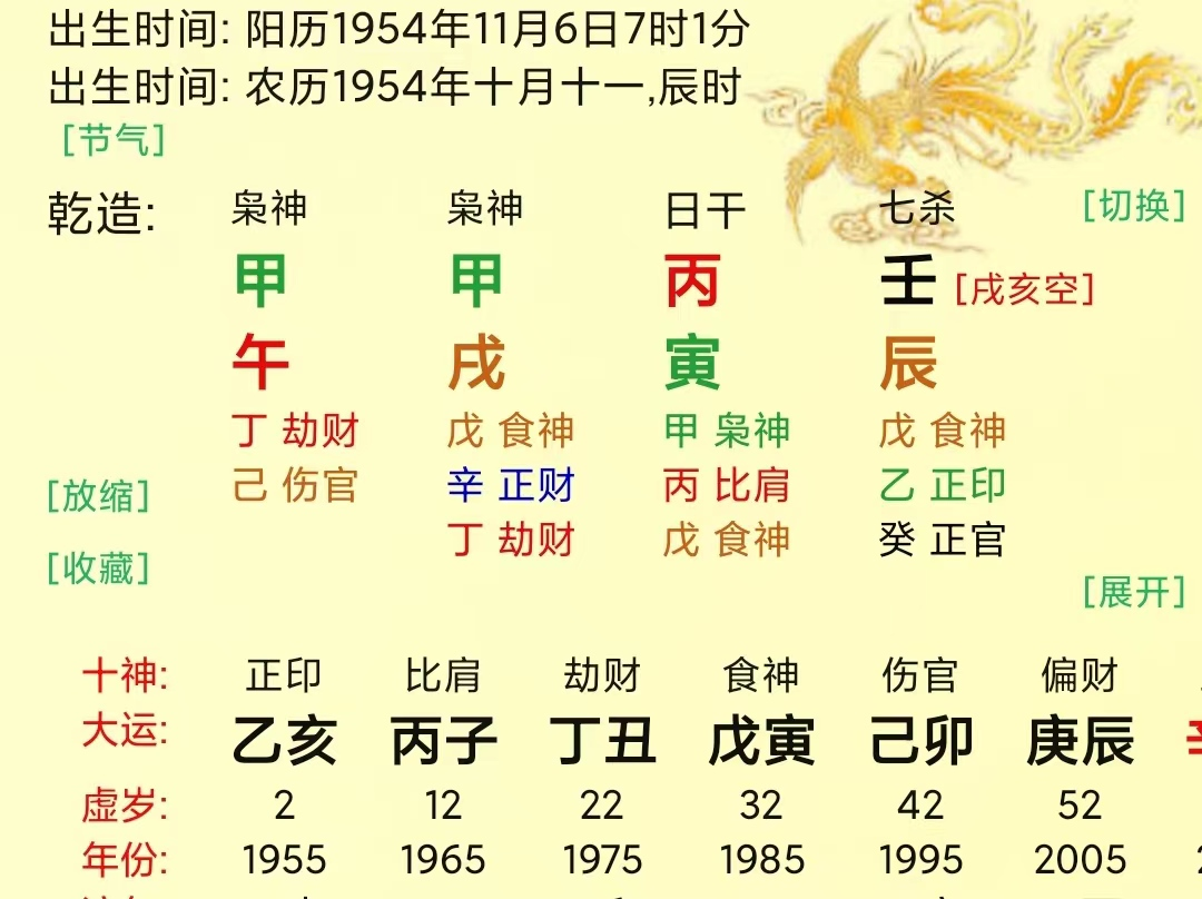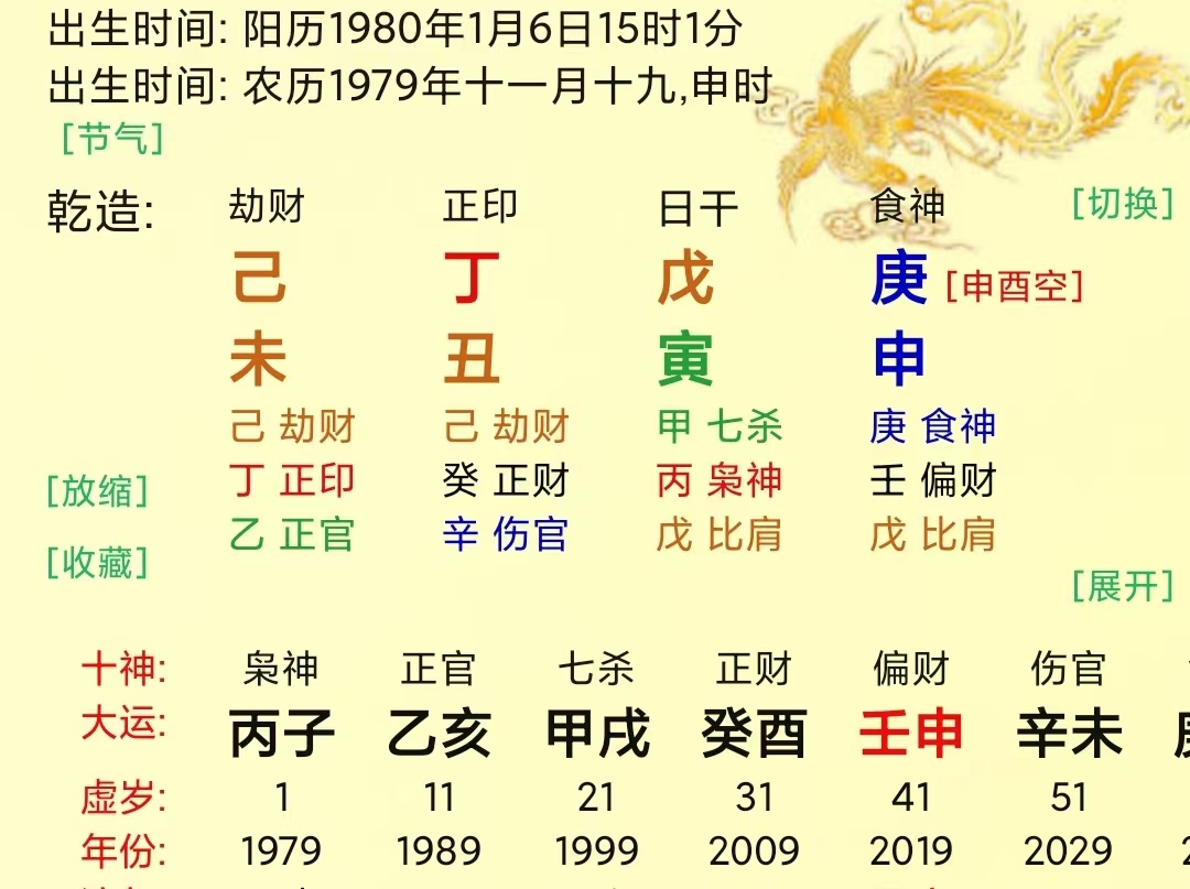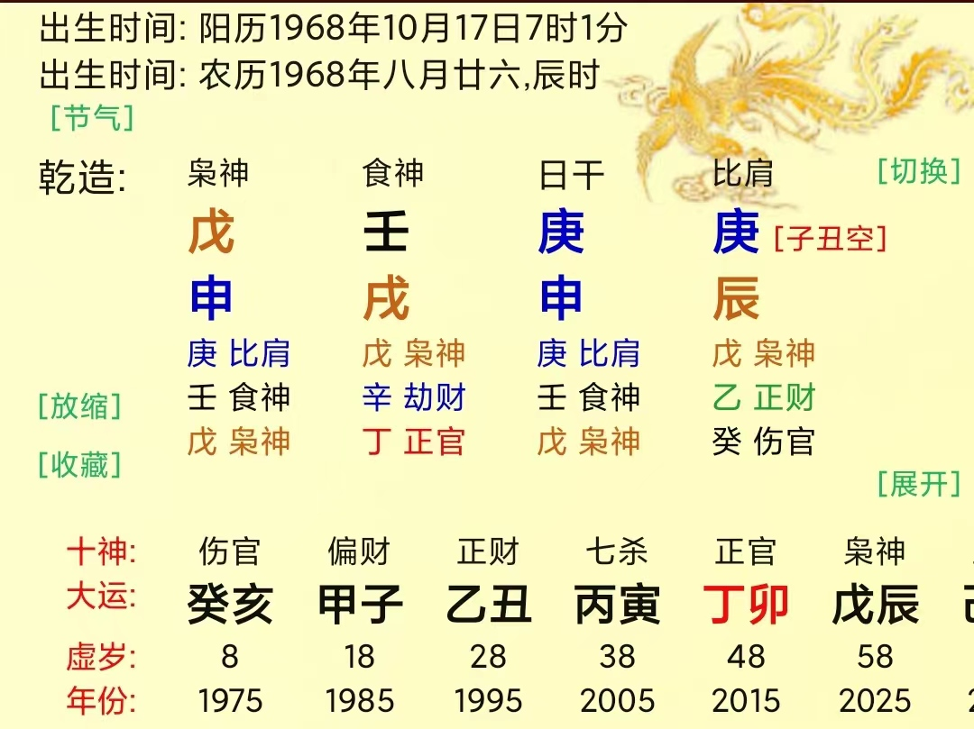 5、甲肝原局土金两旺,木入墓于辰土遭本气所耗。待岁运引发,土旺木折,金木交战,木受克无数,有患肝胆疾病之兆。