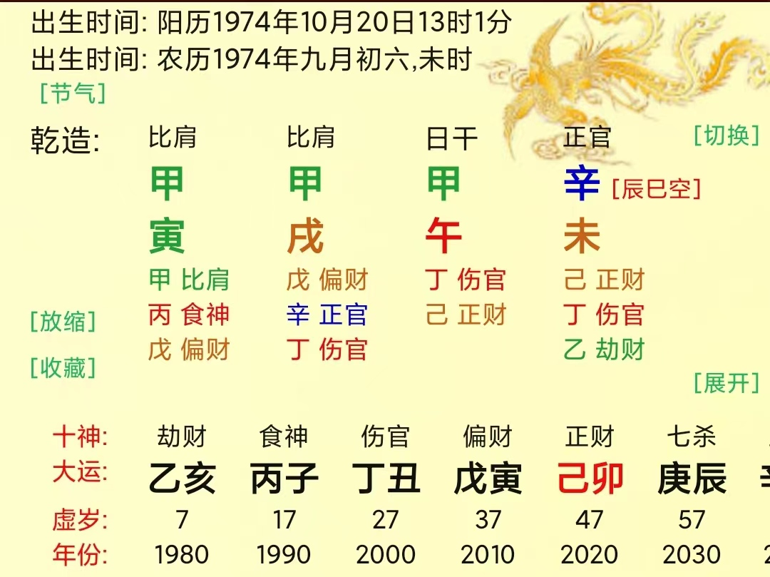 原局木土两旺,木遭耗泄交加。甲木为肝胆,局中有患肝胆疾病的信息。