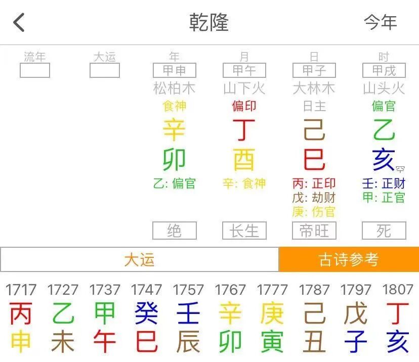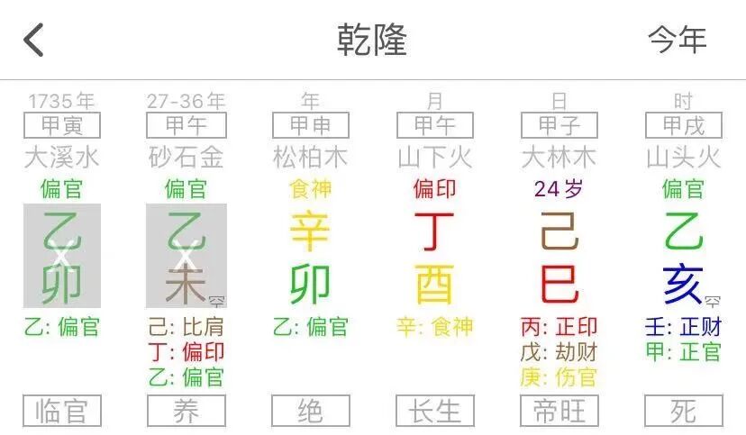 所以1736也是个重要的年份,恰好是乾隆帝换大运的时刻,乙未切换到甲午,七杀变正官。要换那个庚金日主的,虽然也是同一年换大运,但大运是正财换偏财,啥玩意啊……