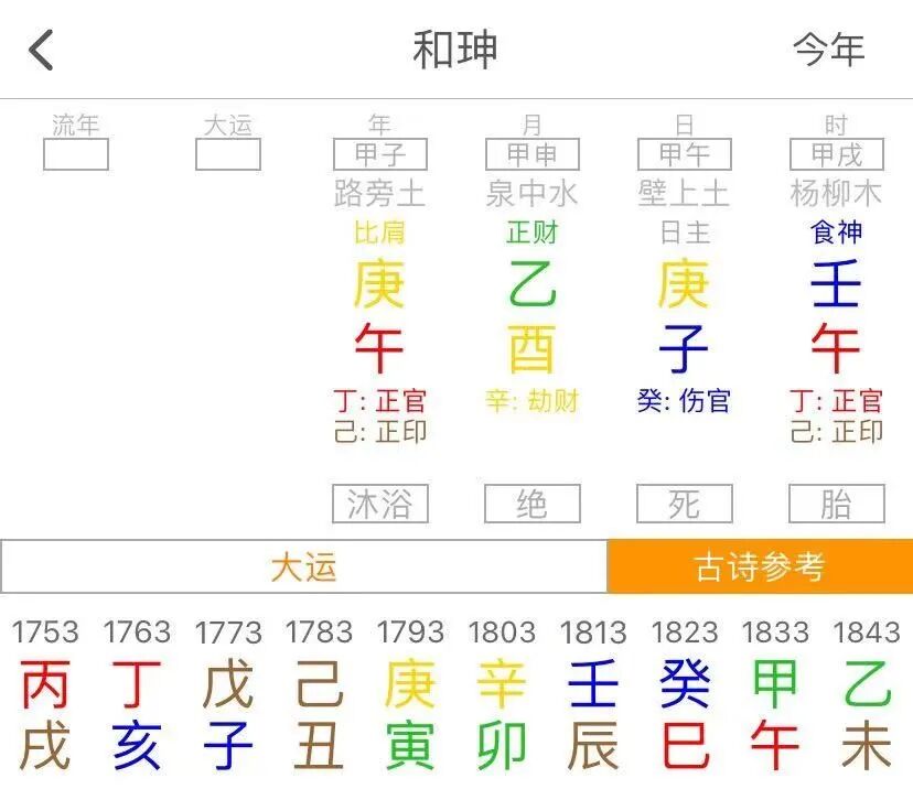 行,我们再看看同时期的人物,乾隆的手下大臣和珅的八字,这个总能对比出一二了吧?