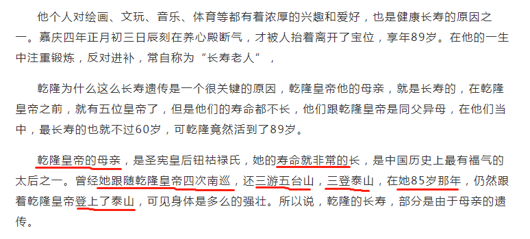 摘一段对乾隆养生、长寿的描述: