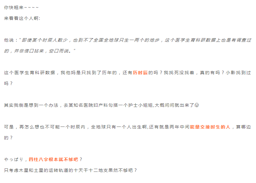 毫不夸张的讲,这个世界上真的有很多人死了都不知道自己的真实八字,所以讨论相同八字命运不同的前提——“样本误差”都没有人来修正。又有多少双胞胎跨时辰了?简直就是天文数字,不去详细对比根本无法知道真相。