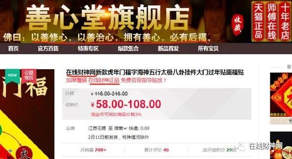 上图是江苏无锡善心堂淘宝店的截图,截图上写着“以善修心,以善治心,拥有善心,必有后福,善心堂旗舰店。”同时宣称“在线财神网新款、正品”,在线财神网已经发布声明了,这纯粹是冒充在线财神网骗人,与在线财神网没有丝毫关系。善心堂淘宝店显示月销量700以上,加上善心堂拼多多店铺、京东店铺、微店店铺等平台的销量,每月都有众多的上当受骗者,参阅在线财神网《关于善心堂冒充在线财神网、山寨五行八卦福的声明》。